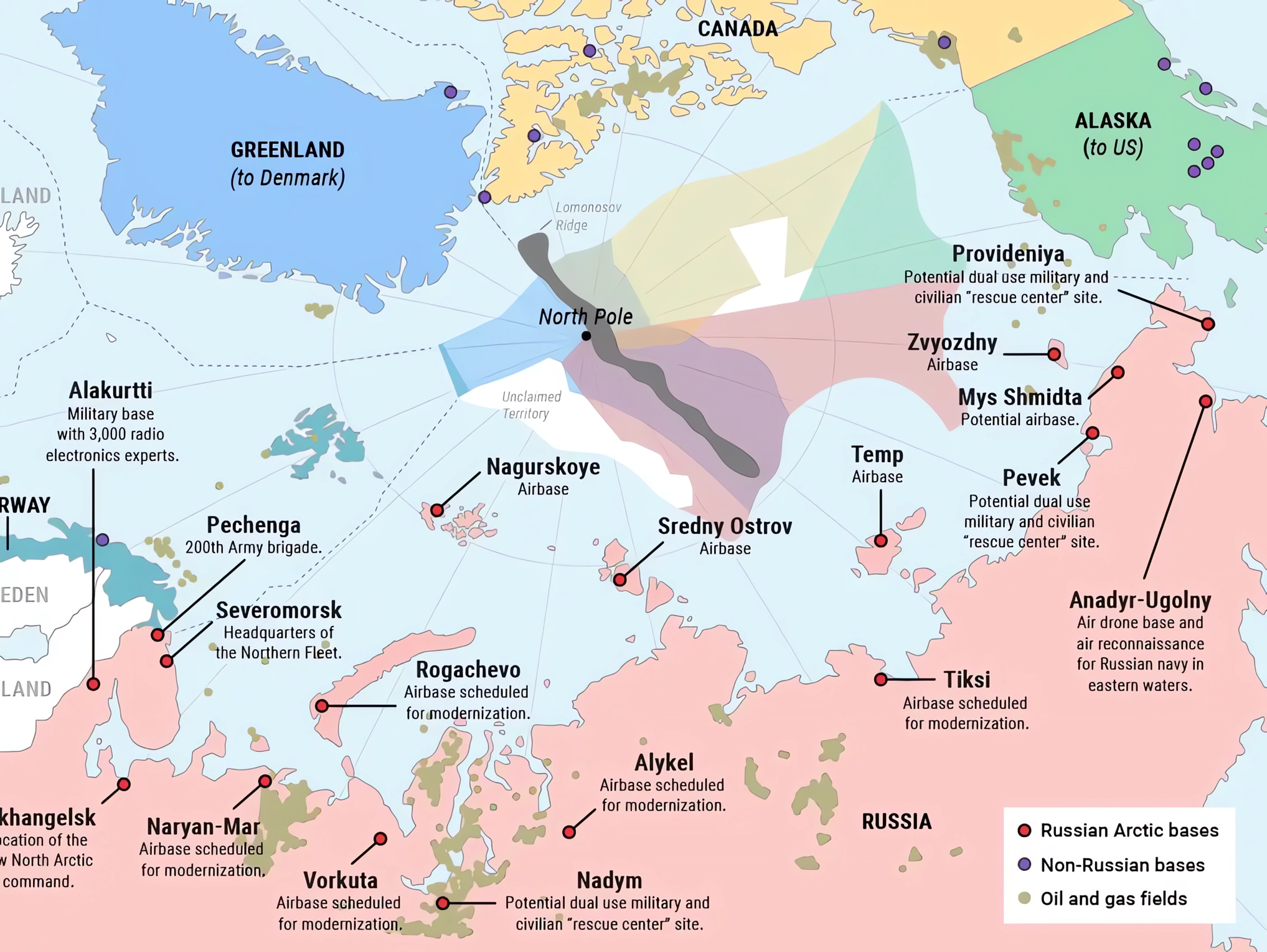 En conjunto, estas bases forman una especie de “escudo ártico ruso”, que va desde la península de Kola hasta Chukotka, cubriendo todo el frente ártico ruso.
