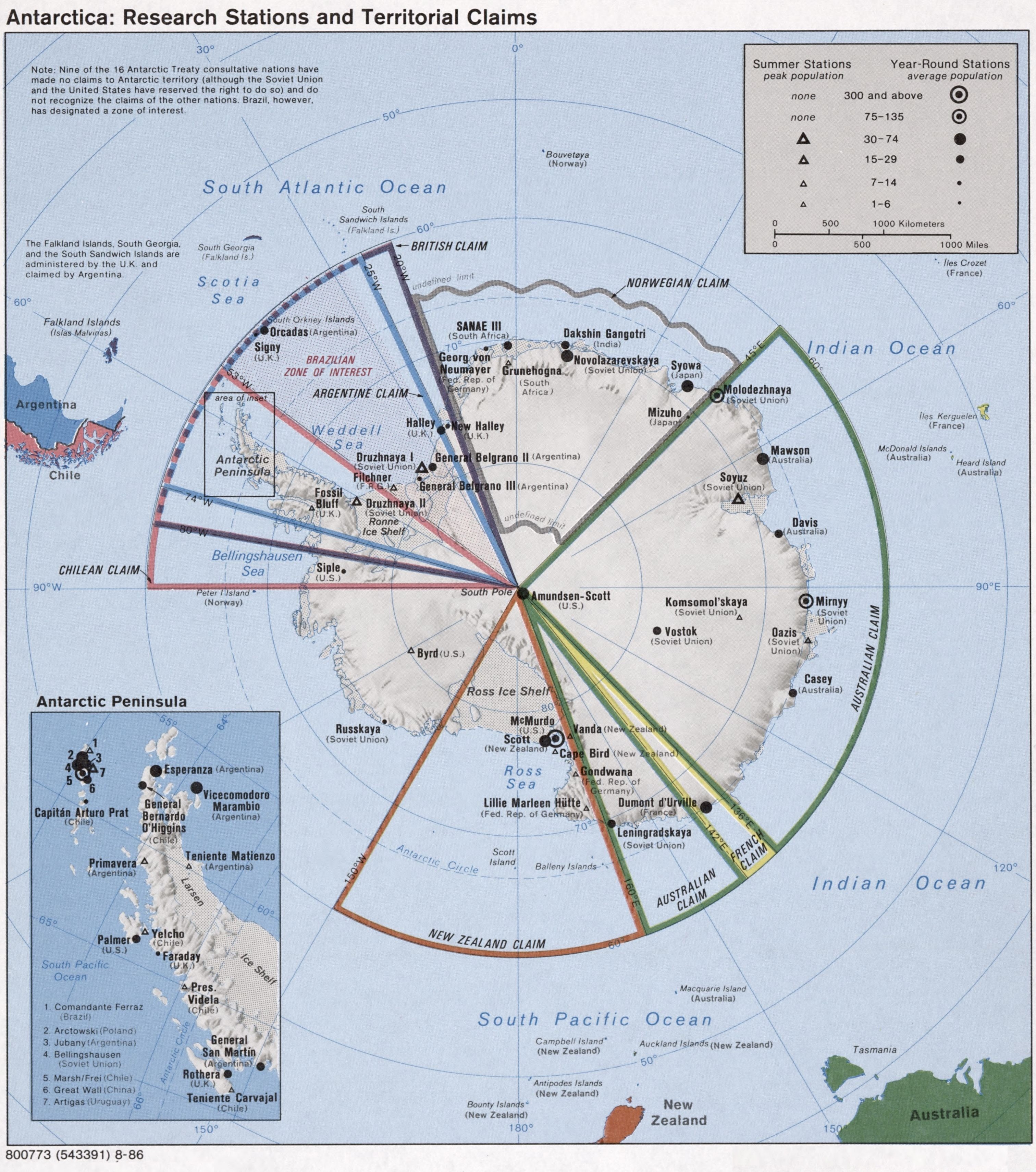 El sector entre 90°O y 150°O (llamado a veces Tierra de Marie Byrd) no pertenece a ningún país y es la mayor zona libre de reclamaciones.