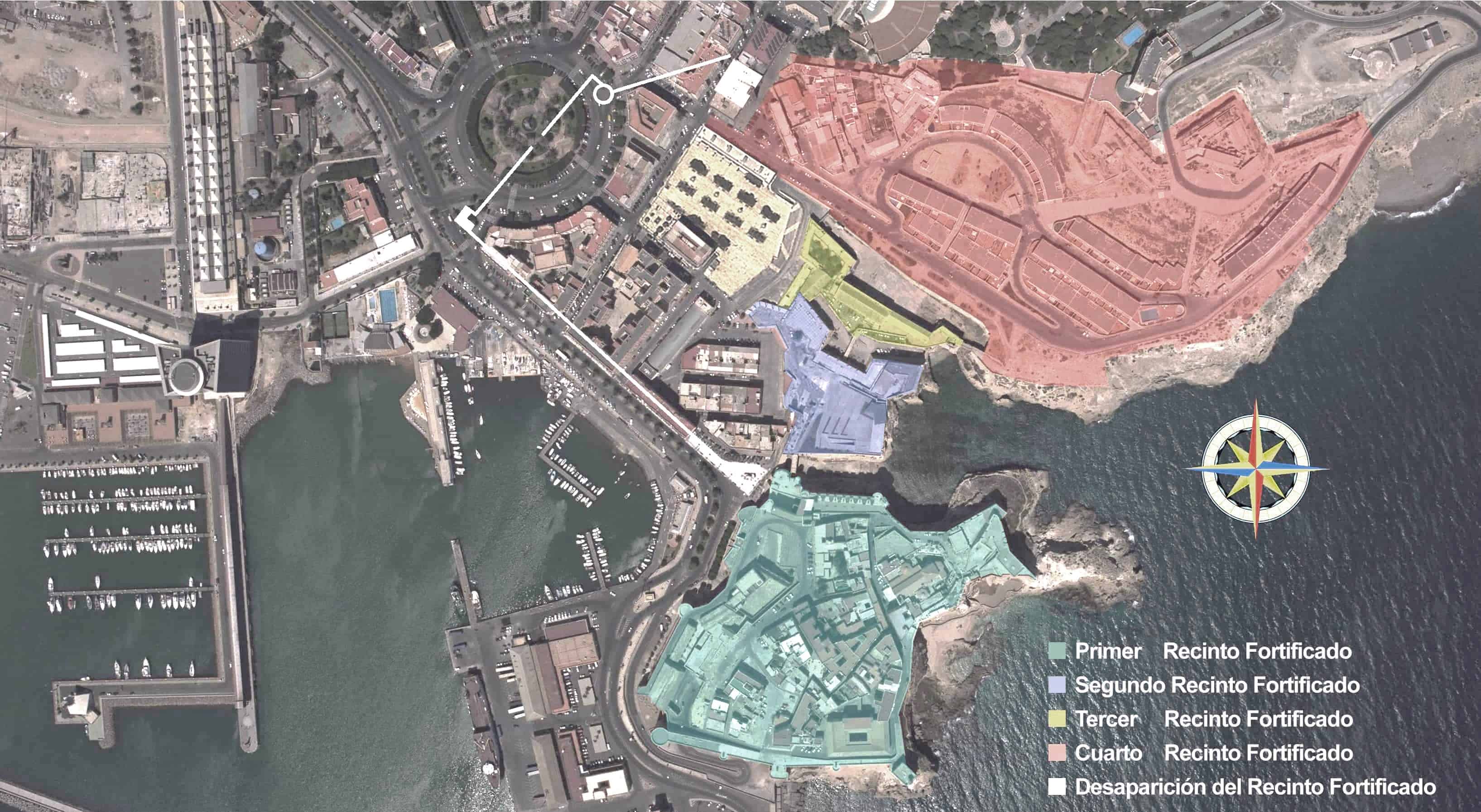 Vista satélite de Melilla la Vieja, la ciudadela fortificada de la ciudad española de Melilla y una de las más grandes de España con 2000 metros de longitud.