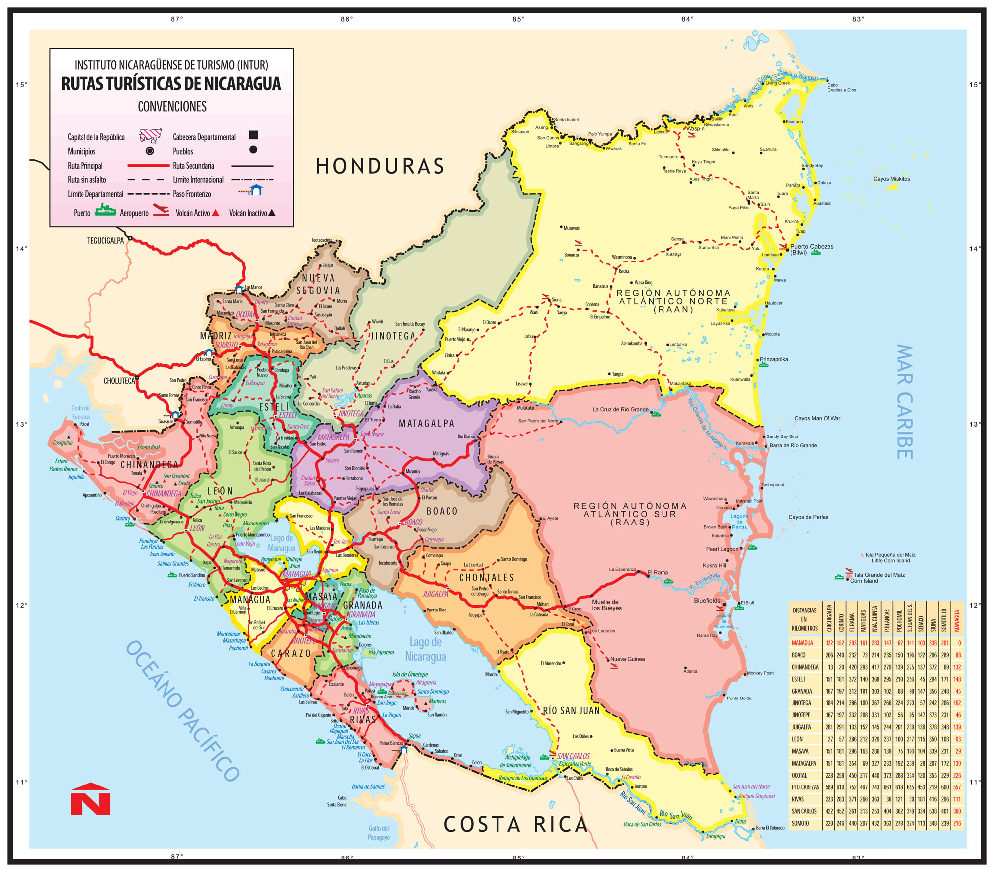 Nicaragua is divided into 15 departments and 2 autonomous regions, which in turn are divided into municipalities. The departments of Nicaragua are Managua (Capital), Boaco, Carazo, Chinandega, Chontales, EstelĂ, Granada, Jinotega, Leon, Madriz, Masaya, Matagalpa, Nueva Segovia, Rio San Juan y Rivas.